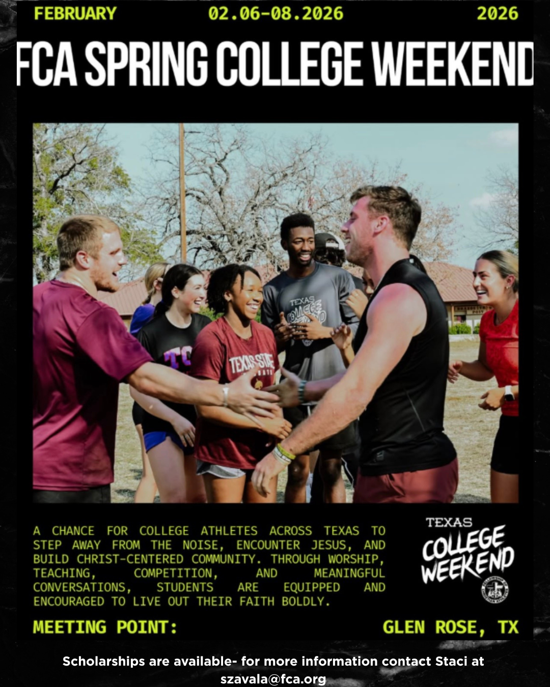 Description: College athletes from all over Texas will unite for an incredible weekend at Riverbend Retreat Center in Glen Rose, Texas, February 6-8! Big university or small college; ALL are welcome! This retreat is packed with powerful worship, dynamic biblical teaching, small group connection, and high-energy competition. Together, we’ll take the next step in our faith journey and be challenged to pursue Jesus with boldness.